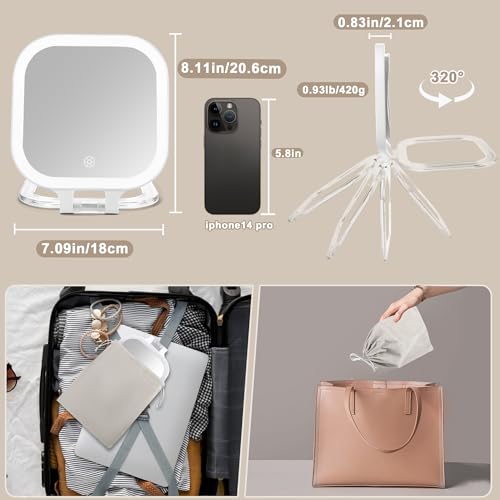 Travel Makeup Mirror with Lights and Magnification, Rechargeable Large Lighted Beauty Mirror with 3 Color, Portable 1x/10x Magnifying Vanity Mirror, Double Sided Led Folding Compact Mirror,Dimmable
