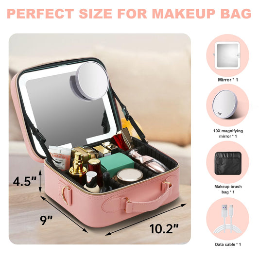 Mocado Travel Makeup Bag with LED Lighted Mirror, Travel Makeup Organizer, Makeup Case with 3 Color Lighted Setting and 10x Magnifying Mirror, Portable Storage and Adjustable Dividers Makeup Box(Pink)