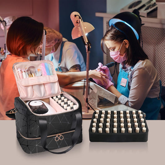 Partreko Large Nail Polish Organizer Fits 54 Bottles (15ml-0.5 fl.oz)& Nail Lamp, Double Layer Nail Supplies Organizer Bag with Holder Strip, PU Leather Nail Kit Storage Travel Case for Women (Black)