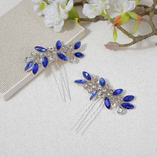 2Pcs Crystal Bridal Hair Pins, Rhinestone Royal Blue Hair Accessories, Decorative Sparkle Wedding Hairs Pins, Blue Silver Hairs Clips for Prom Women Girls Bridesmaids