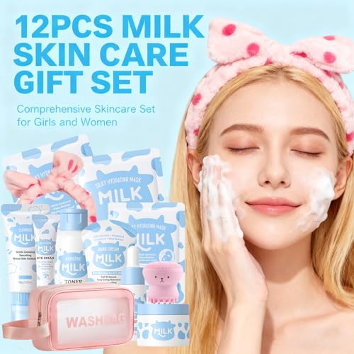 Milk Skincare Set for Kids,12 IN 1 Moisturizing & Gentle Milk Skin Care for Teens 10-12, Kids Skin Care Set for Girls Ages 8-12, Travel Essentials Face Skincare for Girls 10-12 Kit, All Skin Types