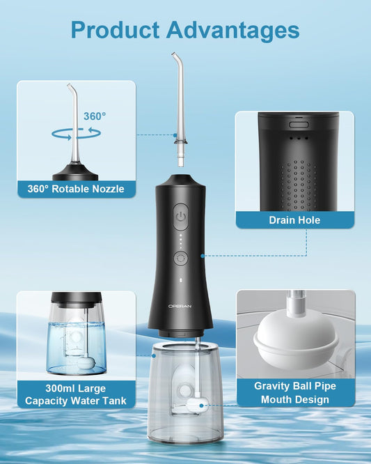 Operan Water Flosser for Teeth Cleaning Upgraded 300ml Cordless Water Dental Flossers Rechargeable Oral Irrigator with 4 Modes 4 Jet Tips IPX7 Waterproof Water Floss for Home Travel (Black)+1Pack