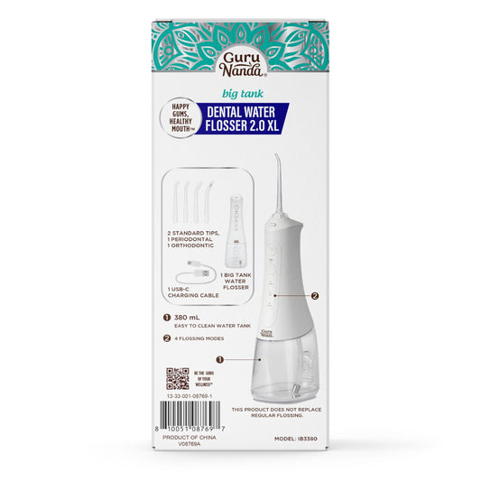 GuruNanda Water Dental Flosser 2.0 XL – 380ML Large Tank, 4 Flossing Modes, Cordless & Portable with Smart Timer for Deep Cleaning & Happy Gums - White