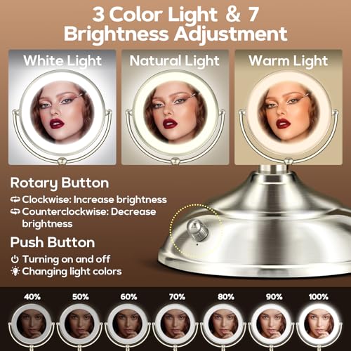 Makeup Mirror with Lights, 9" 20X Magnifying Mirror with Light and 3 Colors, Vanity Mirror with Lights and Adjustable Brightness, 2-Sided Desk Mirror with Light for Makeup, Nickel