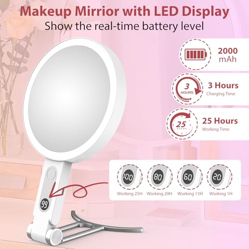 Travel Makeup Mirror with Lights, 1X/20X Magnifying Lighted Makeup Mirror with LED Display ,2-Sided Rechargeable Beauty Mirror with 3 Color Lights & Touch Control, Adjustable Vanity Mirror for Women