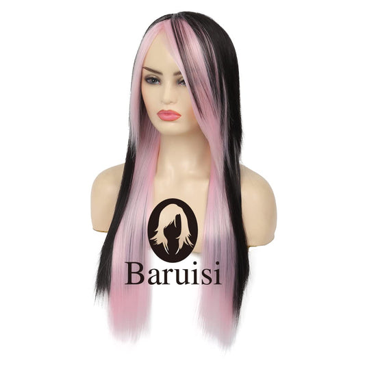 Silky Straight Long Red Black Wig with Side Bangs - Heat Resistant Synthetic Hair for Halloween