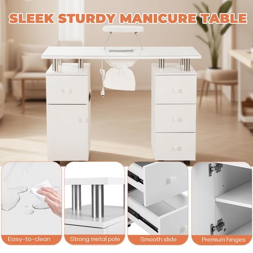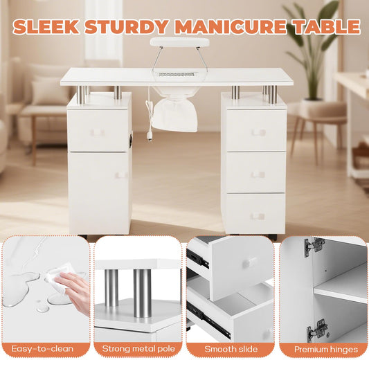Manicure Table Nail Tech Desk with Electric Dust Collector, Nail Table Station w/Charging Socket, 4 Drawers, Lockable Wheels & 2 Wrist Rests – Professional Nail Station for Salon & Home, Snowy White