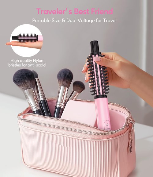 FARERY Mini Thermal Brush 3 Temperature Adjustable, 3/4 Inch Travel Curling Iron for Short Hair, Heated Round Brush for Touch ups and Small Curls, Travel Size Curling Wand, Dual Voltage, Pink