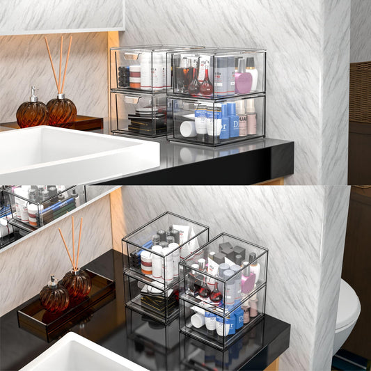 Cq acrylic Stackable Storage Drawers Set of 2,Under Cabinet Stackable Bins and Pull out Drawers Storage Container,4.4'' Tall Clear Plastic Organizer Bins for Makeup,Beauty Product,Machine Organizing