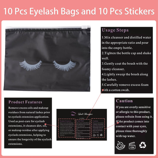 50pcs Lash Extension Cleaning Kit for Clients,10pcs Lash Brushes,10pcs Eyelash Cleaning Brush with Tubes,10pcs Lash Bottles,10pcs Eyelash Aftercare Bags,10pcs Lash Shampoo Label Stickers(Black)