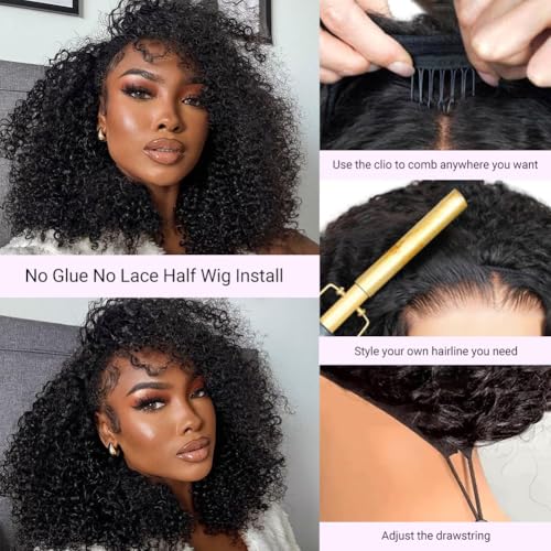 Curly Half Wig Human Hair Wear and Go Glueless Wigs Human Hair 200% Density Kinky Curly 3 In 1 Half Wigs for Women Drawstring Seamless Flip Headband Wig Beginner Friendly 22 Inch