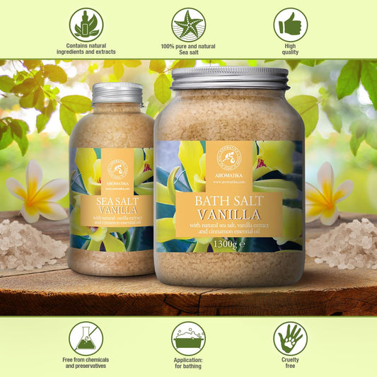 Bath Sea Salt Vanilla 46 Oz (1300g) - 100% Natural Sea Salt with Vanilla Extract & Cinnamon Essential Oil - Relaxing Bath - Beauty - Body Care - Relaxation - Good Sleep - Aromatherapy Bath Salts