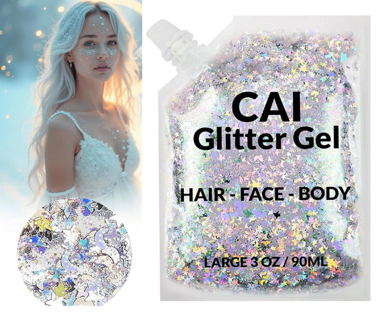 Face, Body & Hair Glitter Gel – Halloween Glitter for Kids and Women – 3 Oz Cosmetic-Grade Gel w/Moon & Stars for Festivals & Halloween Party, Easy Apply & Wash Off - Blue 2Pack