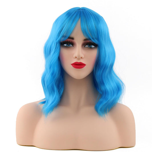 HWHRGL Light Blue Wigs with Bangs for Women 14 Inch Short Wavy Bob Wigs With Bangs Synthetic Bob Wig Curly Wig Heat Resistant Colorful Wavy Wig for Cosplay Daily Party Use Halloween Wigs