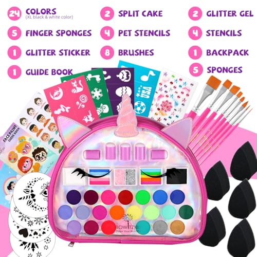 Bowitzki Unicorn Face Paint Kit for Kids-24 Colors,2 Rainbow Glitters&2 Glitter Gels,10 Sponges,8 Brushes,8 Stencils,Gem Stickers&Guidebook-Come with Unicorn Backpack for Party Halloween (Pink)