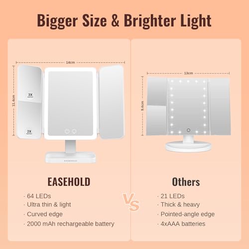 EASEHOLD Lighted Makeup Mirror, Rechargable Vanity Mirror with Magnification, 2X 3X, Trifold Makeup Mirror with Touch Control, 3 Color Dimmable LED Lights, Portable Make up Mirror, Gifts for Women