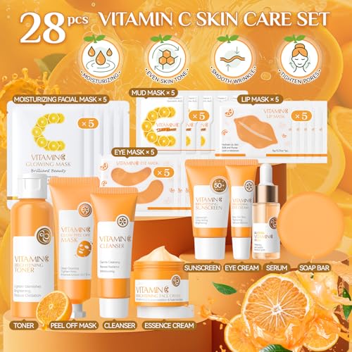 28 Pcs Vitamin C Skin Care Set, Skincare for Girls 10-12, Complete Skincare Routine for Deep Clean, Soft and Hydrated Skin, Ideal Gift for Teen Girls