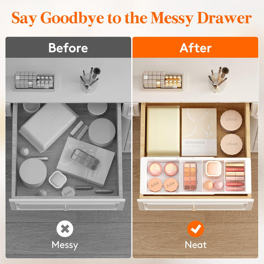 Lifewit 2 Pack Sliding Makeup Drawer Organizer Trays with Inserts, Extendable Hanging Desk Drawer Divider, 14-23" Long/1.8" High Plastic Organizer Tray in Vanity/Bathroom/Office/Kitchen, White