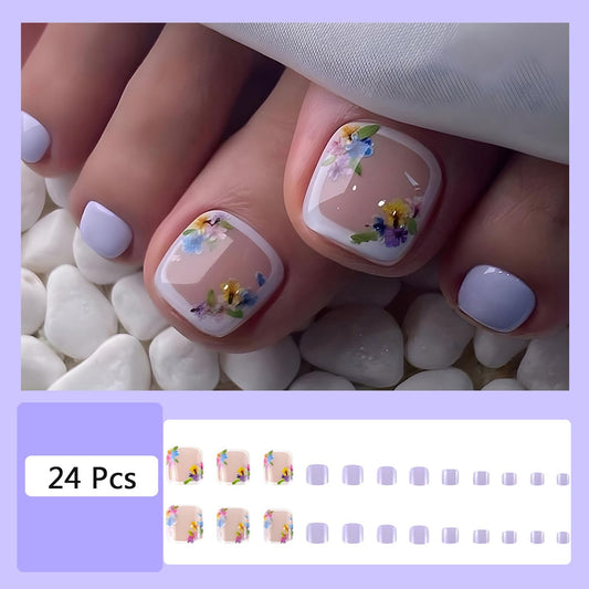 24Pcs Purple Press on Toenails Short Square Fake Toe Nails with Colorful Flower Designs Summer Toenail Press ons Full Cover Cute Acrylic False Toenails Reusable Glue on Toe Nails for Women