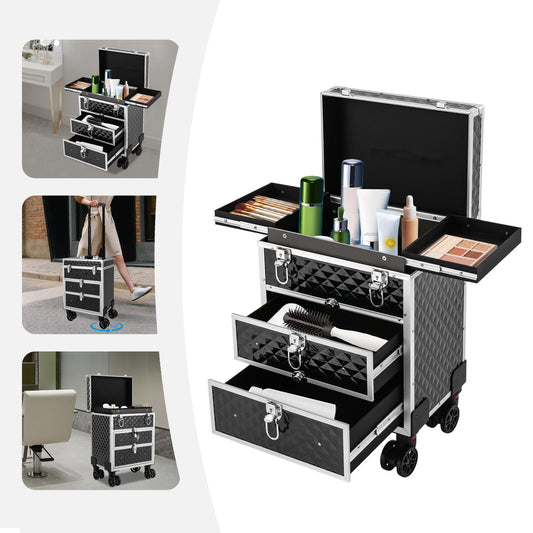 Professional Rolling Makeup Case, Cosmetic Organizer with Sliding Drawers, Makeup Case with 360° Rotatable Wheels