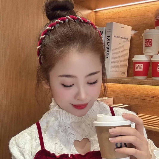 Vintage High Cranium Artificial Pearl Hairband, Bridal Hair Hoops Rhinestones Hair Accessories, Hairs Bands with Teeth Hoop, Fashion Wide Beaded Bling Head Band, Knotted Headband for Women Girls(Red)