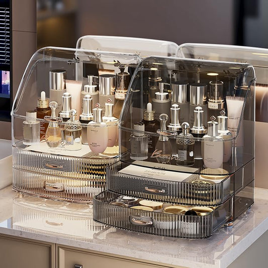 Plukers Makeup Organizer Countertop Vanity with Transparent Lid Drawers Waterproof Dustproof Cosmetic Skincare Bathroom Storage Gift for Women Teens Girls (Clear Black)