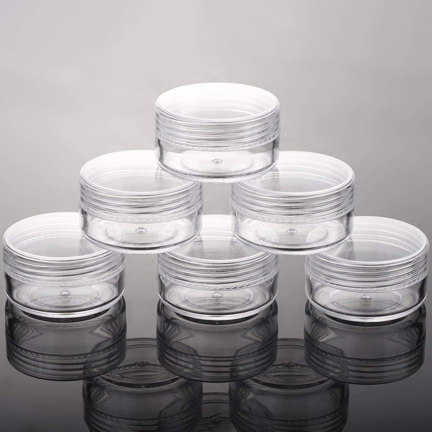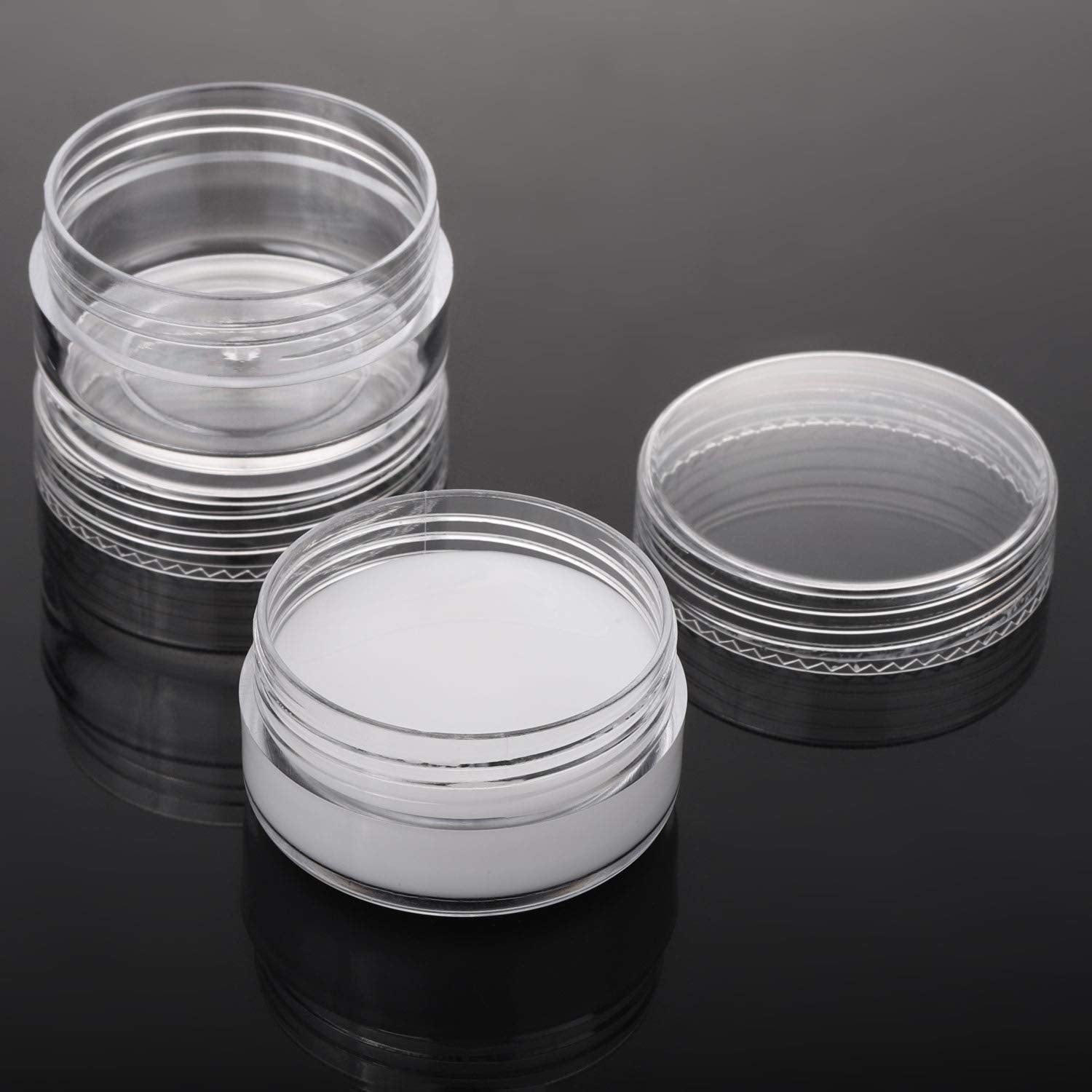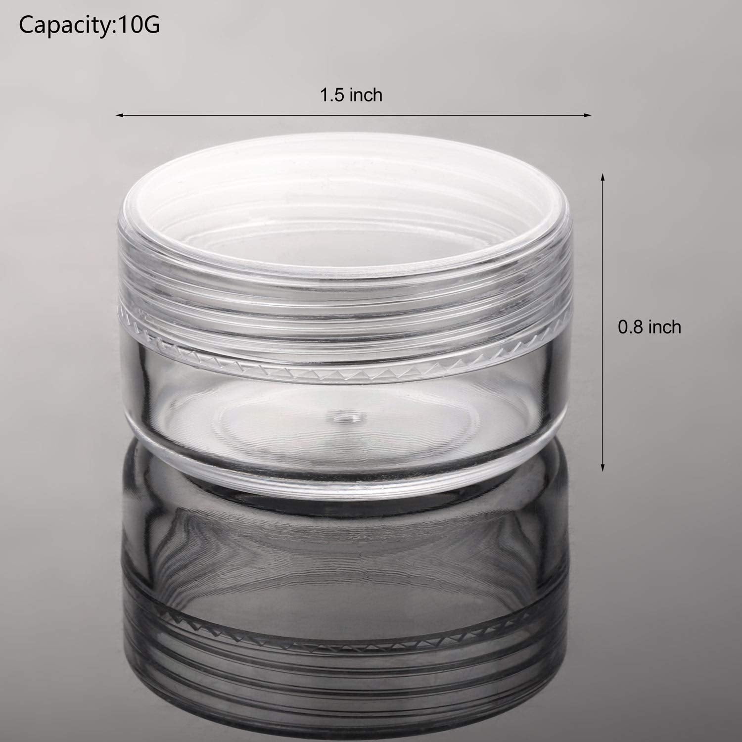 - Quantity: 100 pieces of plastic jars with lids; Capacity: 10g/ 0.34oz. Perfect for storing lotions, lip balms, toners, creams, acrylic powder, and other beauty aids