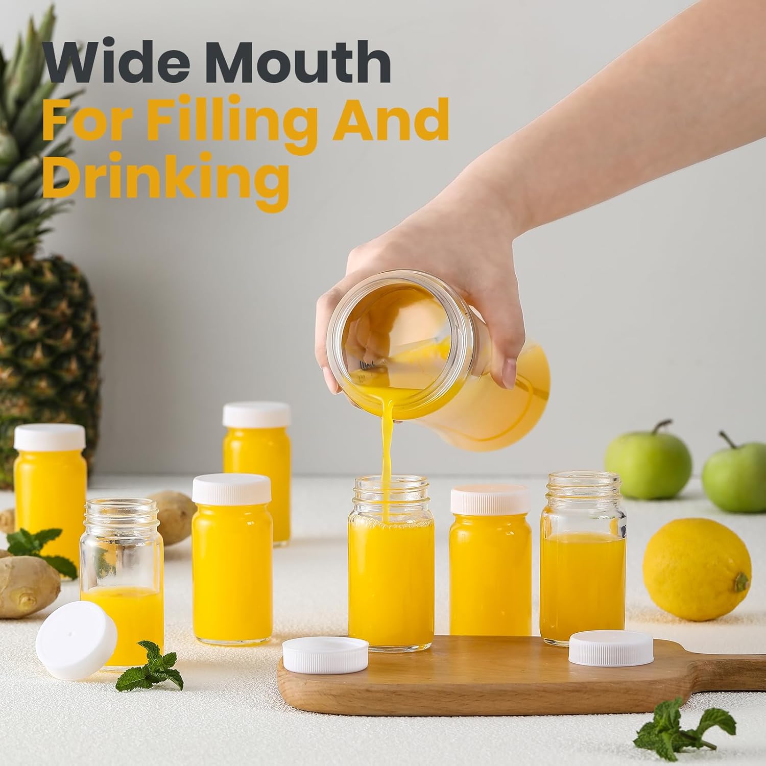 20 Pack 2 oz Glass Shot Mini Bottles w/ White Lids & 20 Labels - Small Clear Jar for Ginger, Wellness Shot, Juice, Sample, Whiskey - Travel Essentials - Wide Mouth, Leakproof, Dishwasher Safe