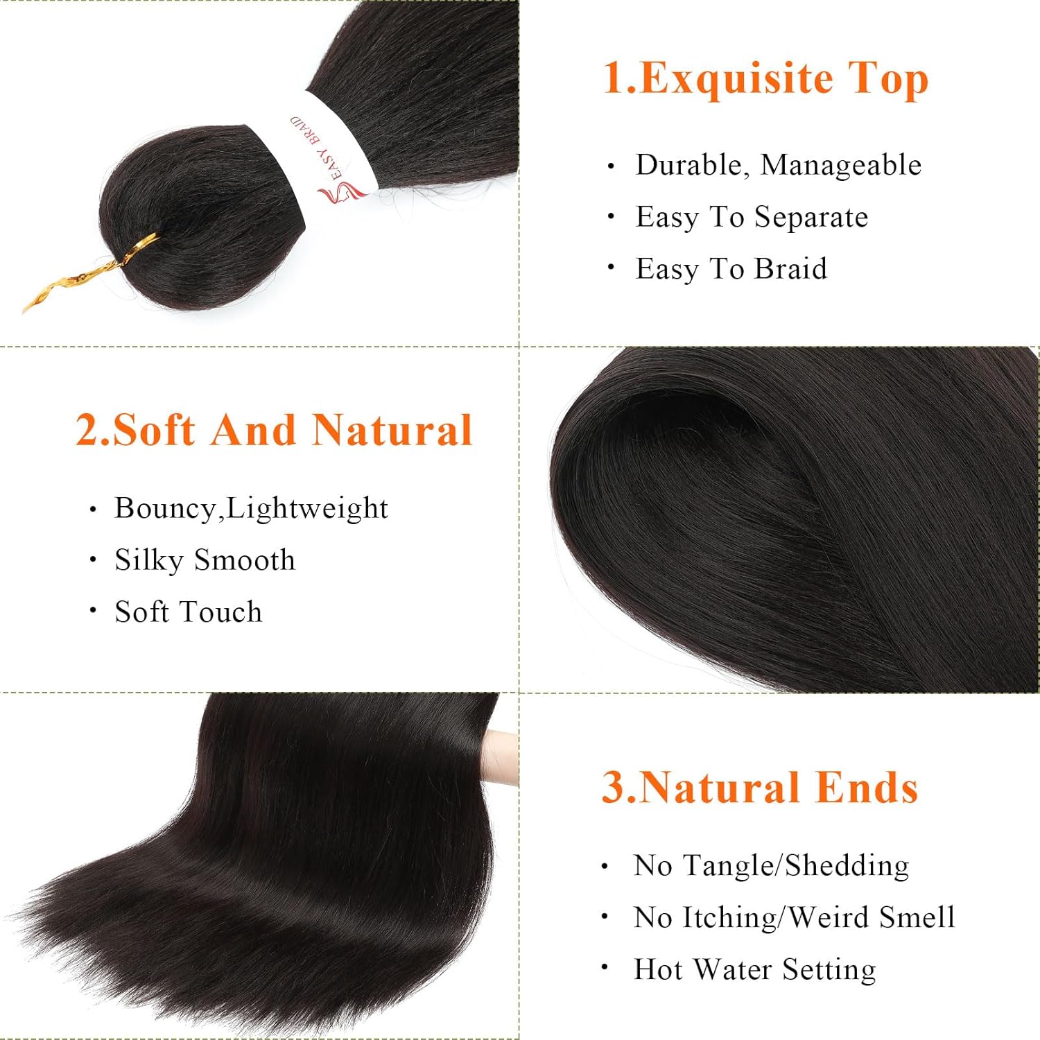 - Braiding Hair Advantages: Braiding Hair Pre Stretched Has a Natural Looking, Yaki Texture, Smooth, Lightweight, Easy To Braid, Soft And Tangle Free, Skin Friendly And Healthy, No Tangle, No Smell, No Shedding.