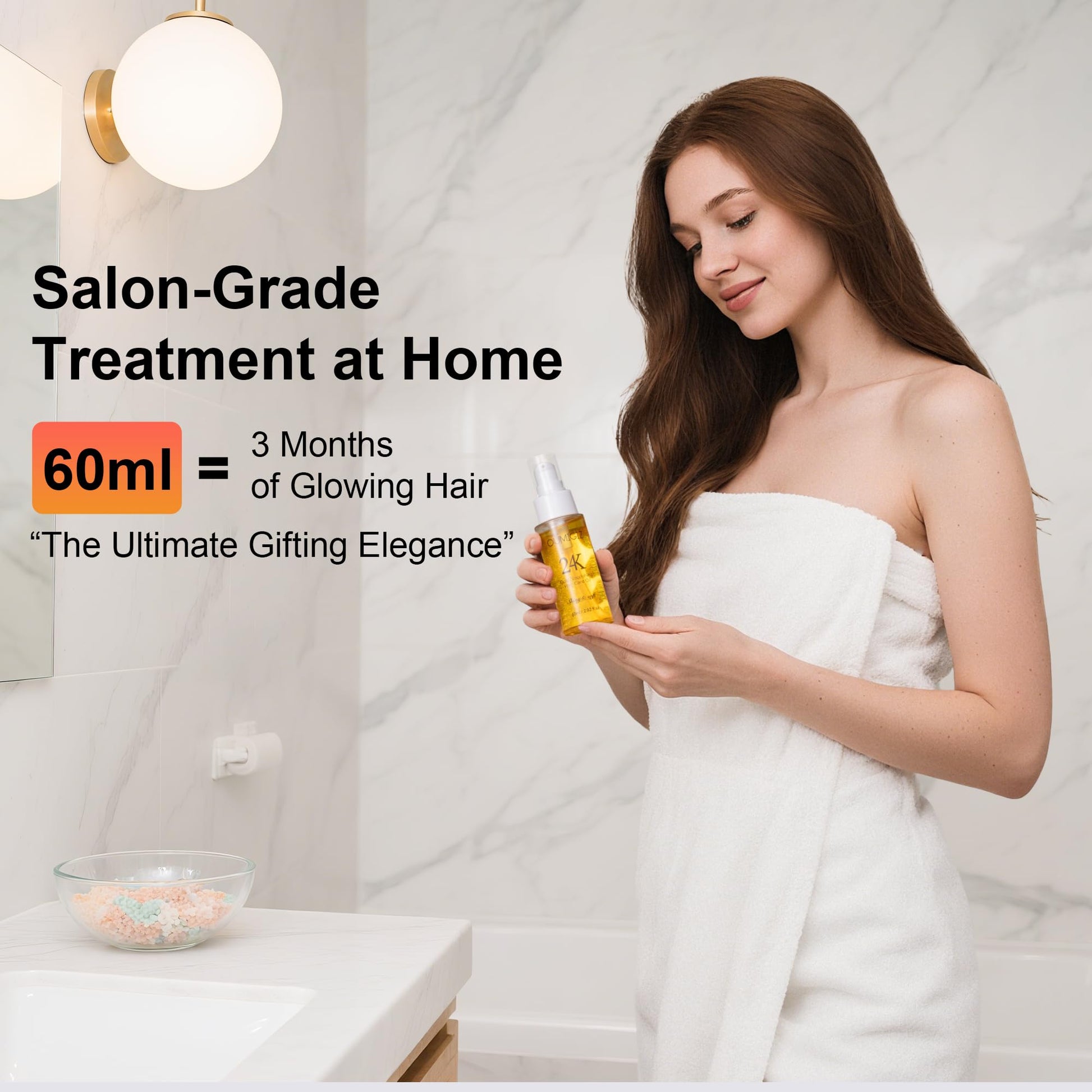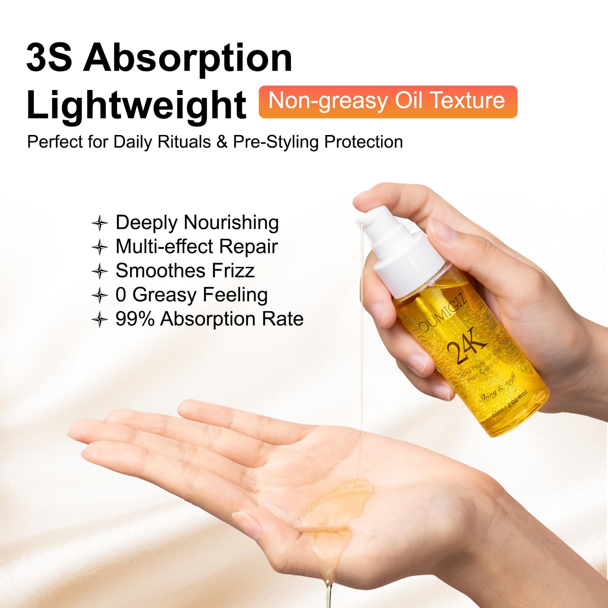 - Deep Repair with 6 Botanical Oils + 24K Gold: A luxury blend of argan, coconut, olive, macadamia, wheat germ, and oat kernel oils—infused with 24K gold and vitamin E. Nourish dry, damaged hair, reduce breakage by 95%, and restore shine & elasticity. Ideal for color-treated, heat-damaged, or chemically processed hair