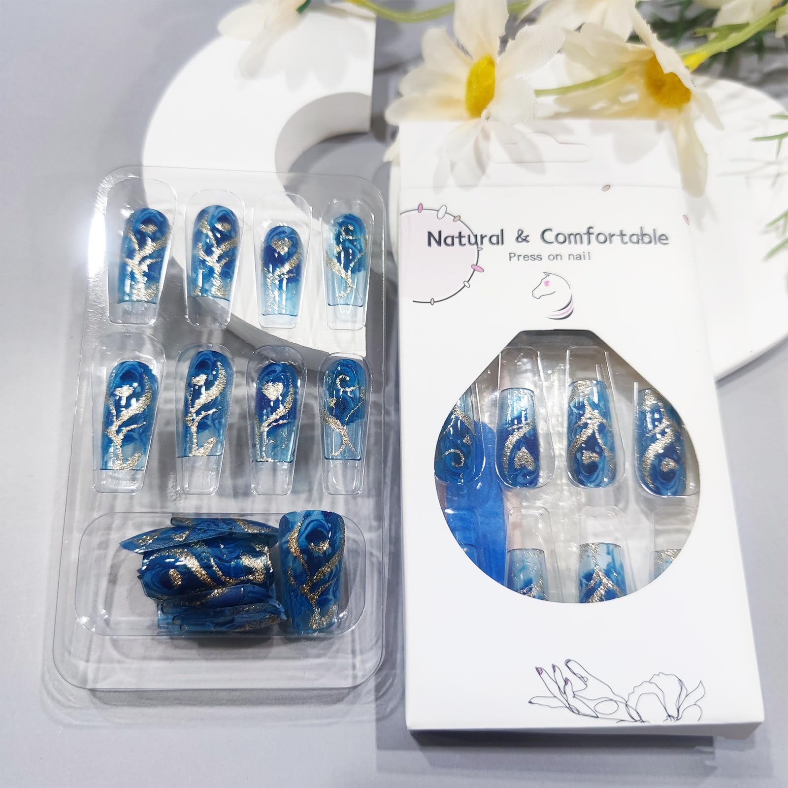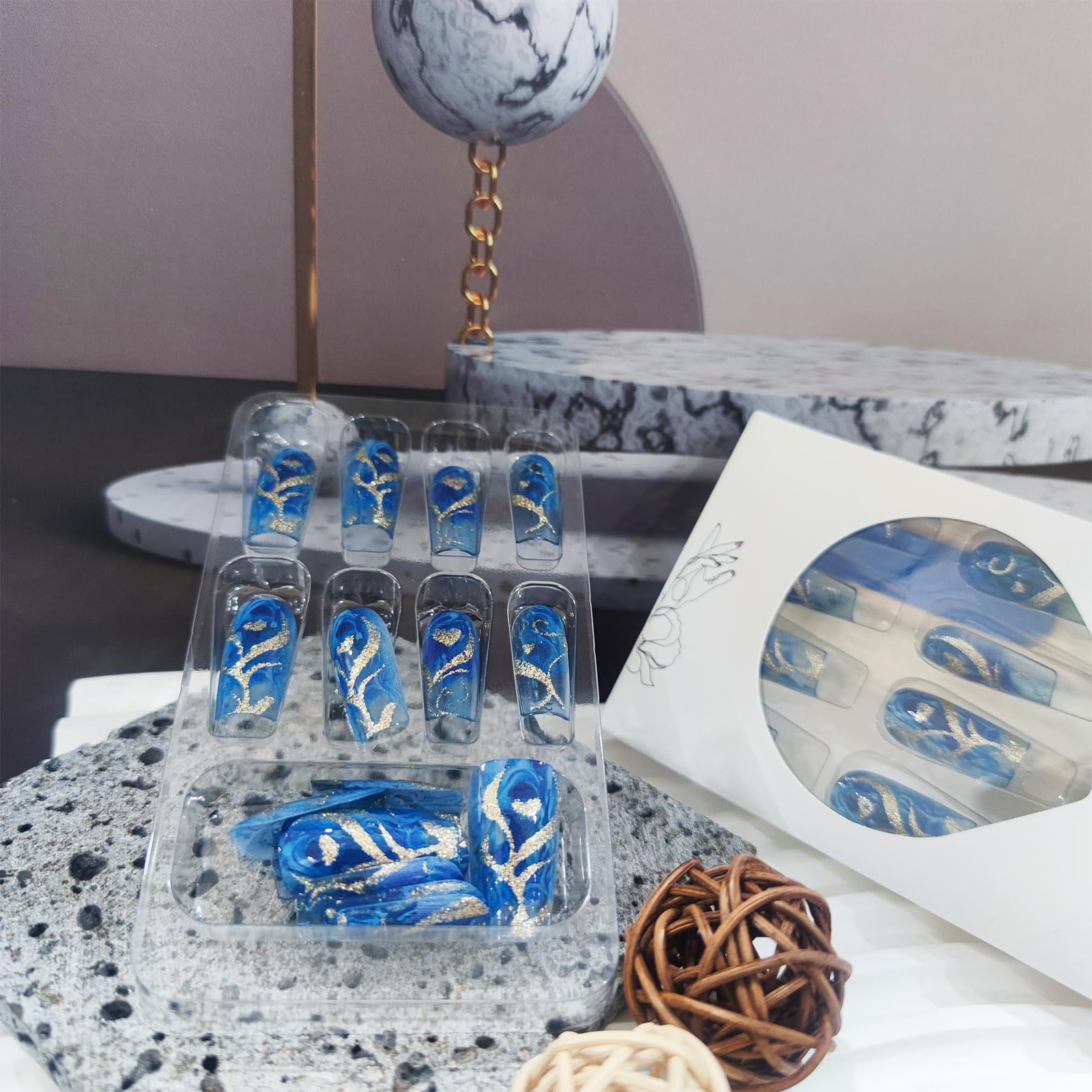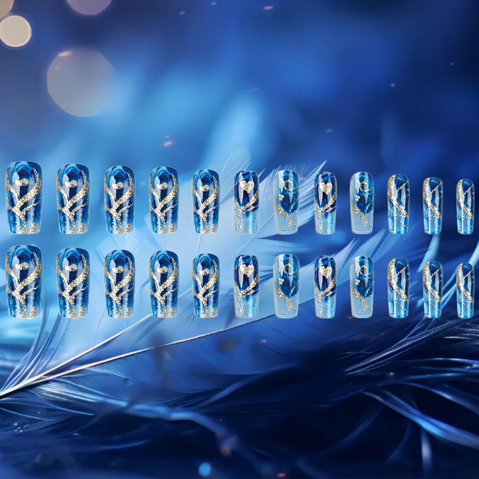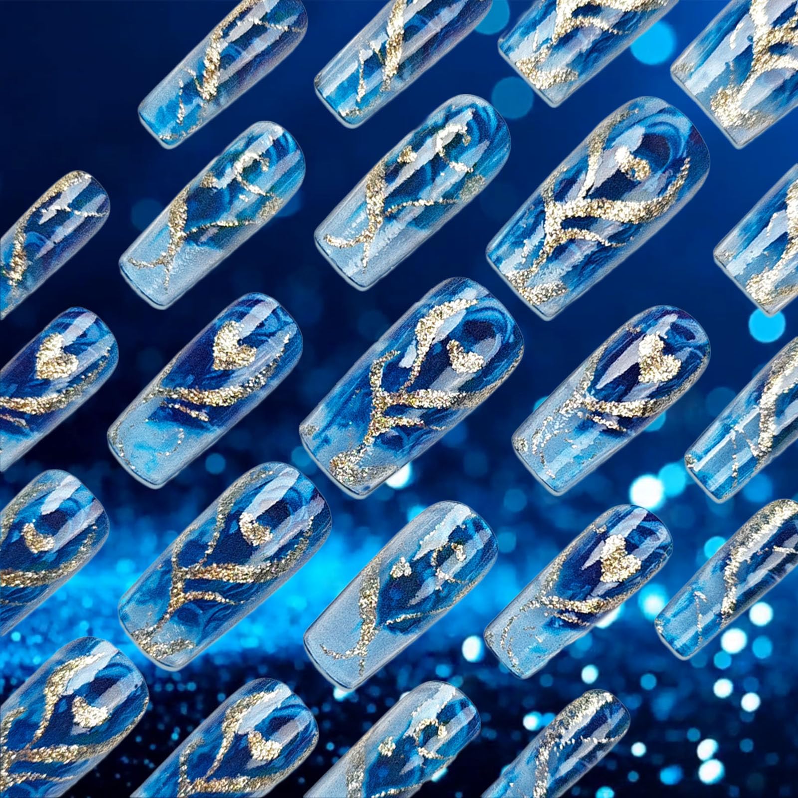 24Pcs Gold Curve Line Press on Nails Sea Acrylic Fake Nail Glossy Blue Gradient Medium Square False Nails Love Heart Stick on Fingernails Seaweed Gel Glue on Nail for Coquette Women Girls