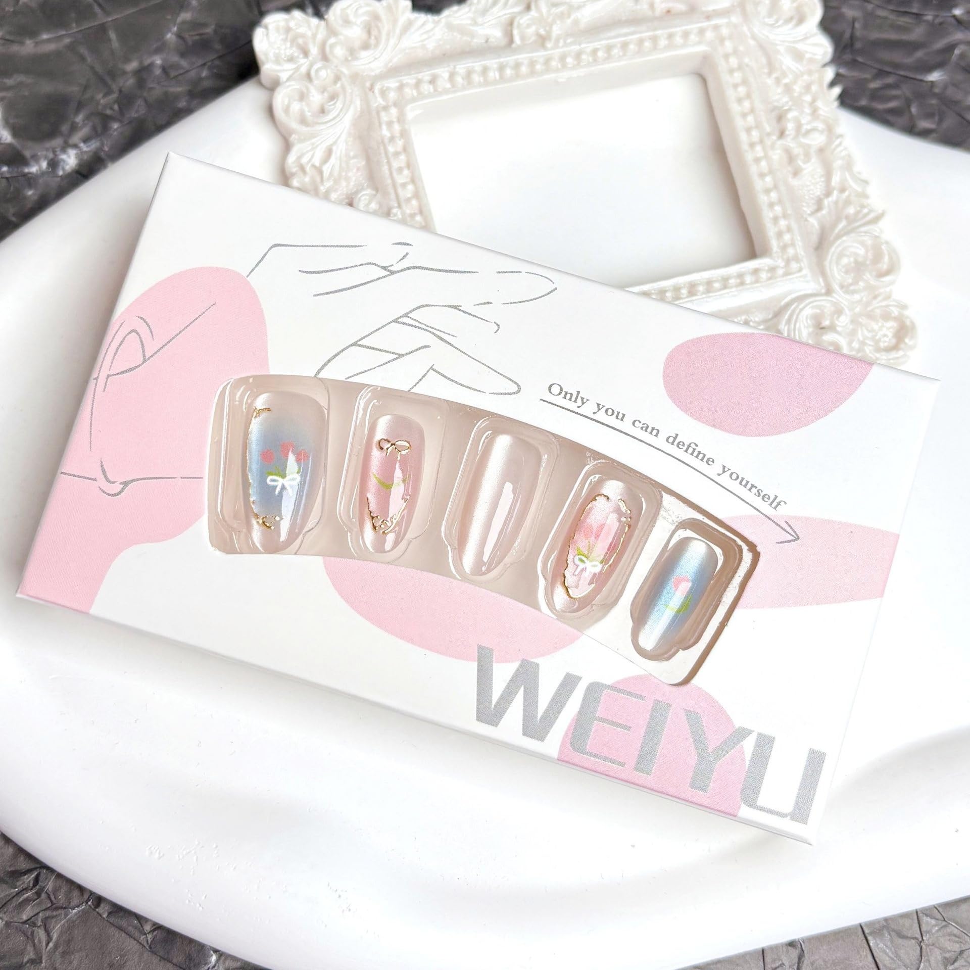1.Pink blue gradient flower press on nails are easy to use, it only takes a few minutes to complete a manicure.