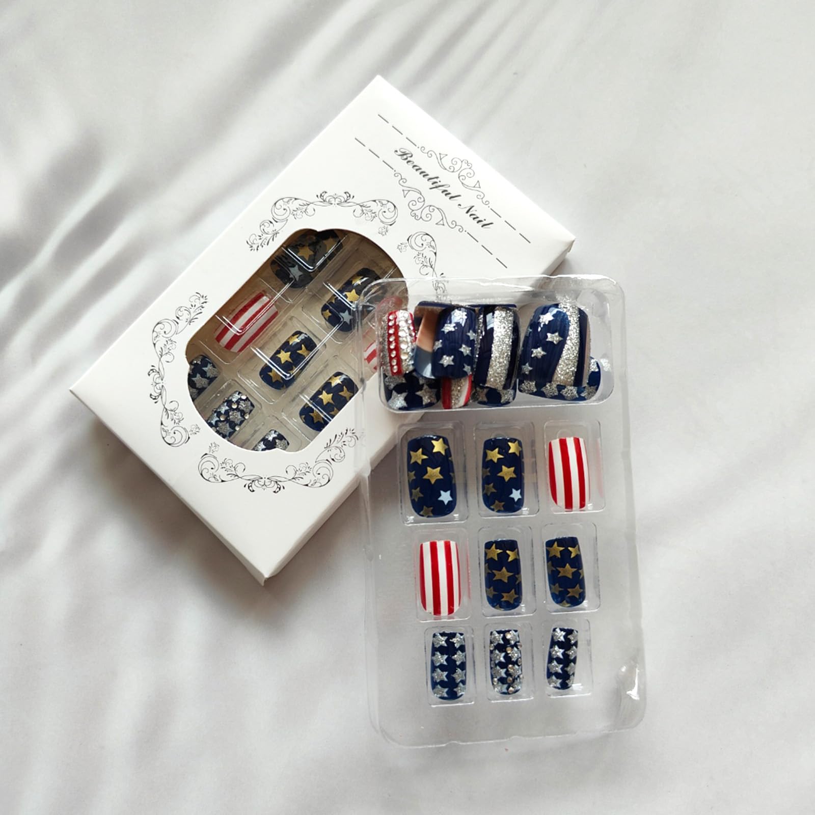Details: Independence Day Press on Nails 4th of July Fake Nails Glossy Red White Blue False Nails Square Acrylic Nails Stick on Fingernails Glue on Nail for Women