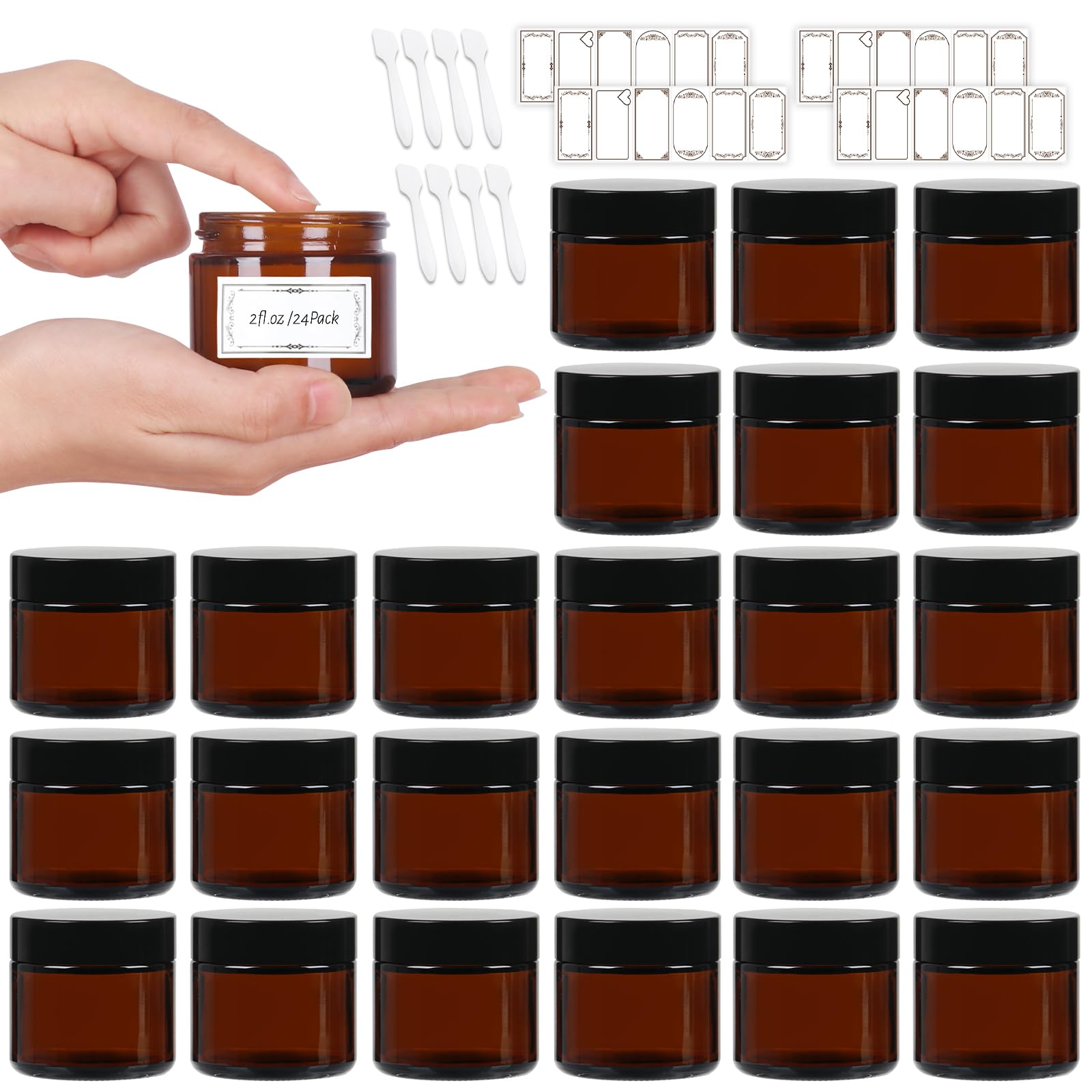 2oz Amber Glass Jars with Lids 24Pack- 2 oz Airtight Small Jars with Lids&Stickers for Cosmetics, Body Butter, Candle Making (2fl.oz-24Pack)