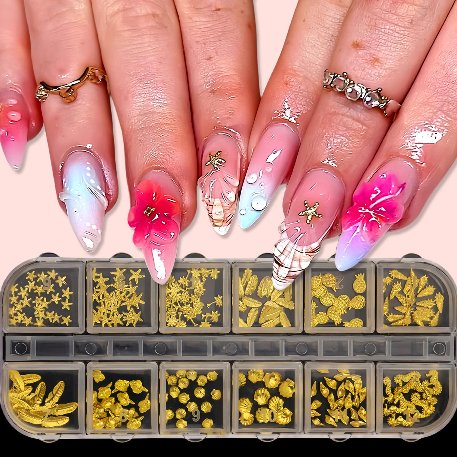 3D Metal Nail Art Studs Mixed Shapes Gold Shell Seahorse Starfish Conch Alloy Nail Rivets Seashell Starfish Nail Rhinestones Ocean Theme Designs Summer Beach DIY Crafts Manicure Decoration 12 Grids