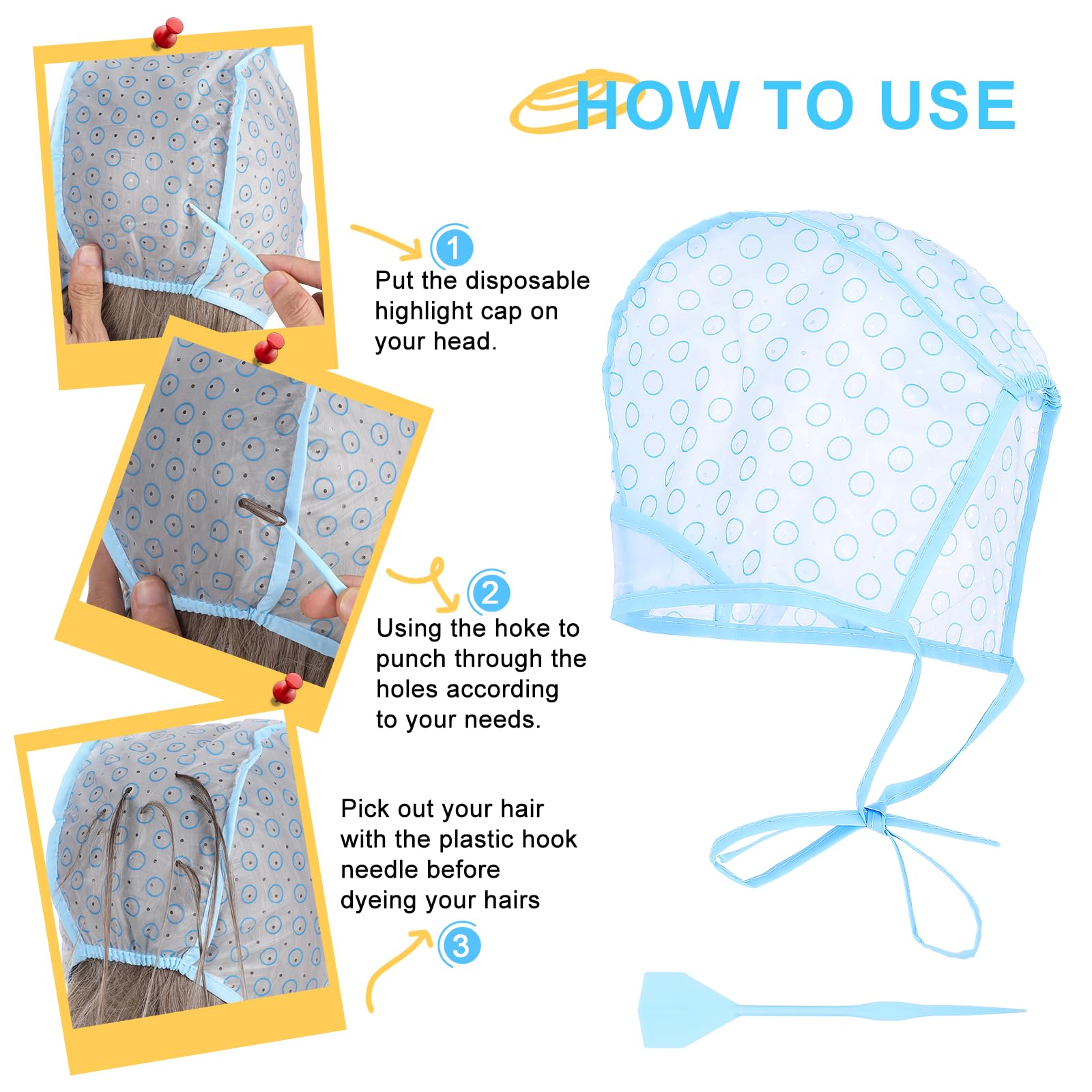 - Easy to Use: Just put on the highlight caps for hair and tie the attached ties together at the neck for a secure fit, then use the crochet of the highlights cap to pierce the hole, pull out the hair to be dyed, and then you can start dyeing. Use our hair highlighting cap to dye your hair, and your friends or passers-by will be amazed by your eye-catching hair color!