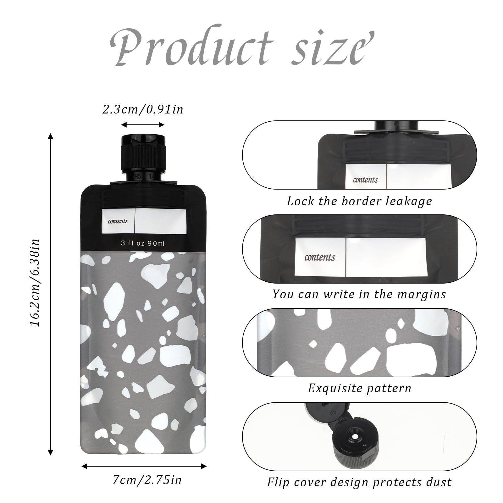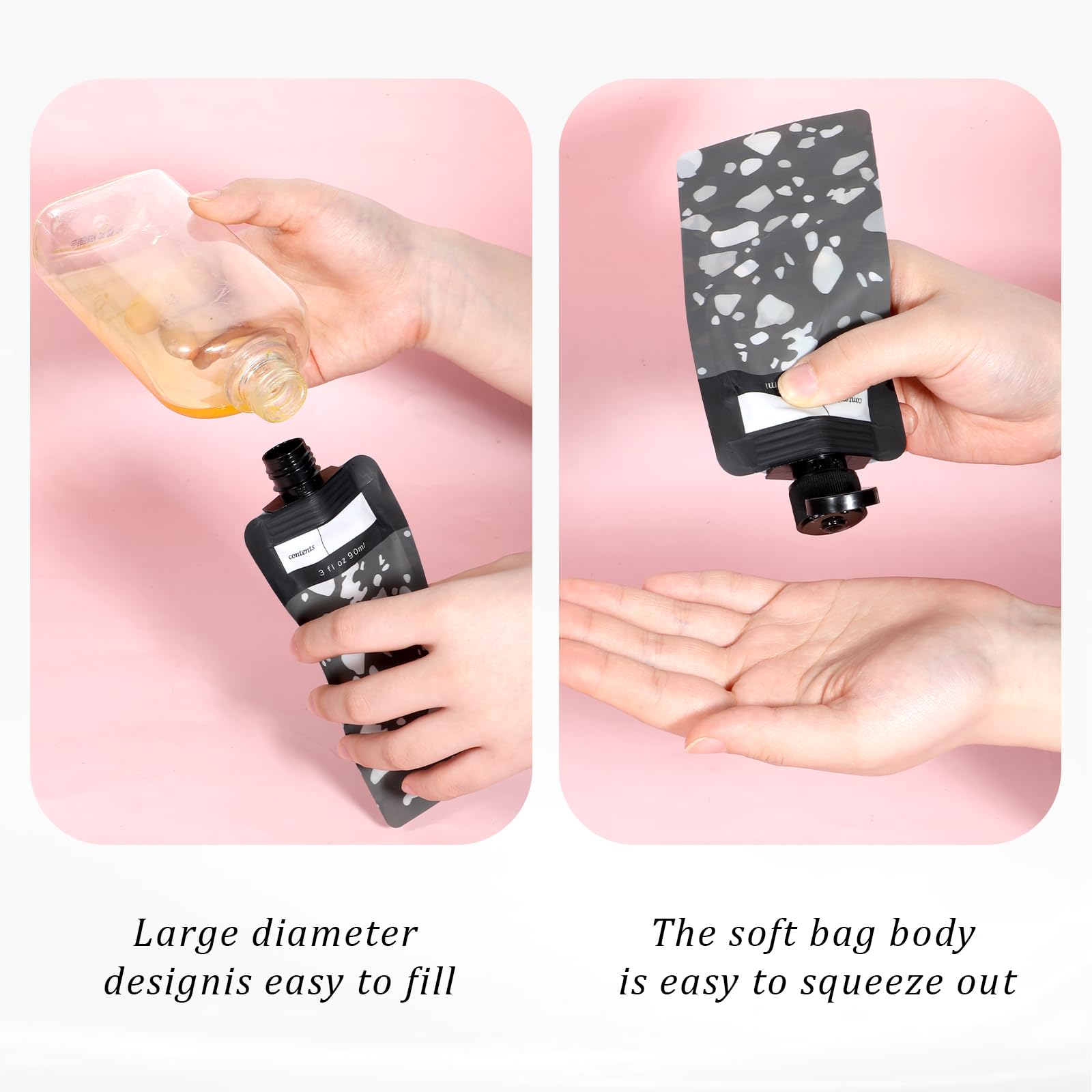- 【Leak-Proof Design】The travel shampoo pouch is designed to be leak-proof. The pouch caps fit tightly with the pouch mouth, ensuring a good seal. Additionally, the reinforced and thickened bag edges ensure that your liquids stay secure, preventing any leakage during transit.