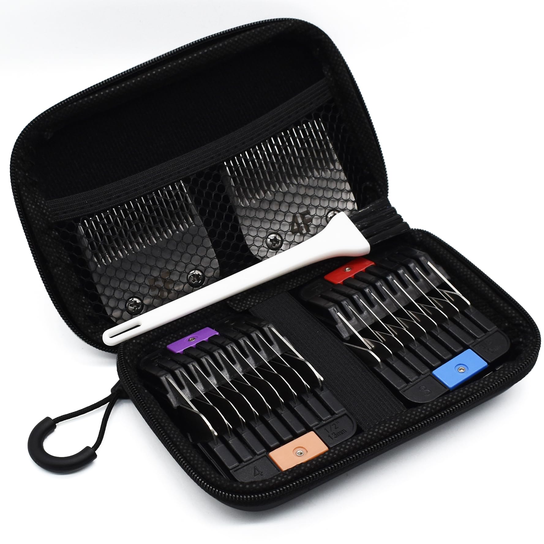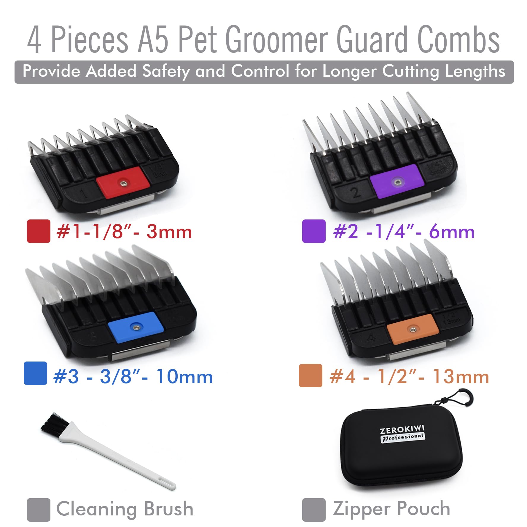 - The package including 4 lengths color-coded guard combs, #1 - 1/8"(3mm) - Red, #2 - 1/4"(6mm) - Purple, #3 - 3/8"(10mm) - Blue, #4 - 1/2"(13mm) - Apricot