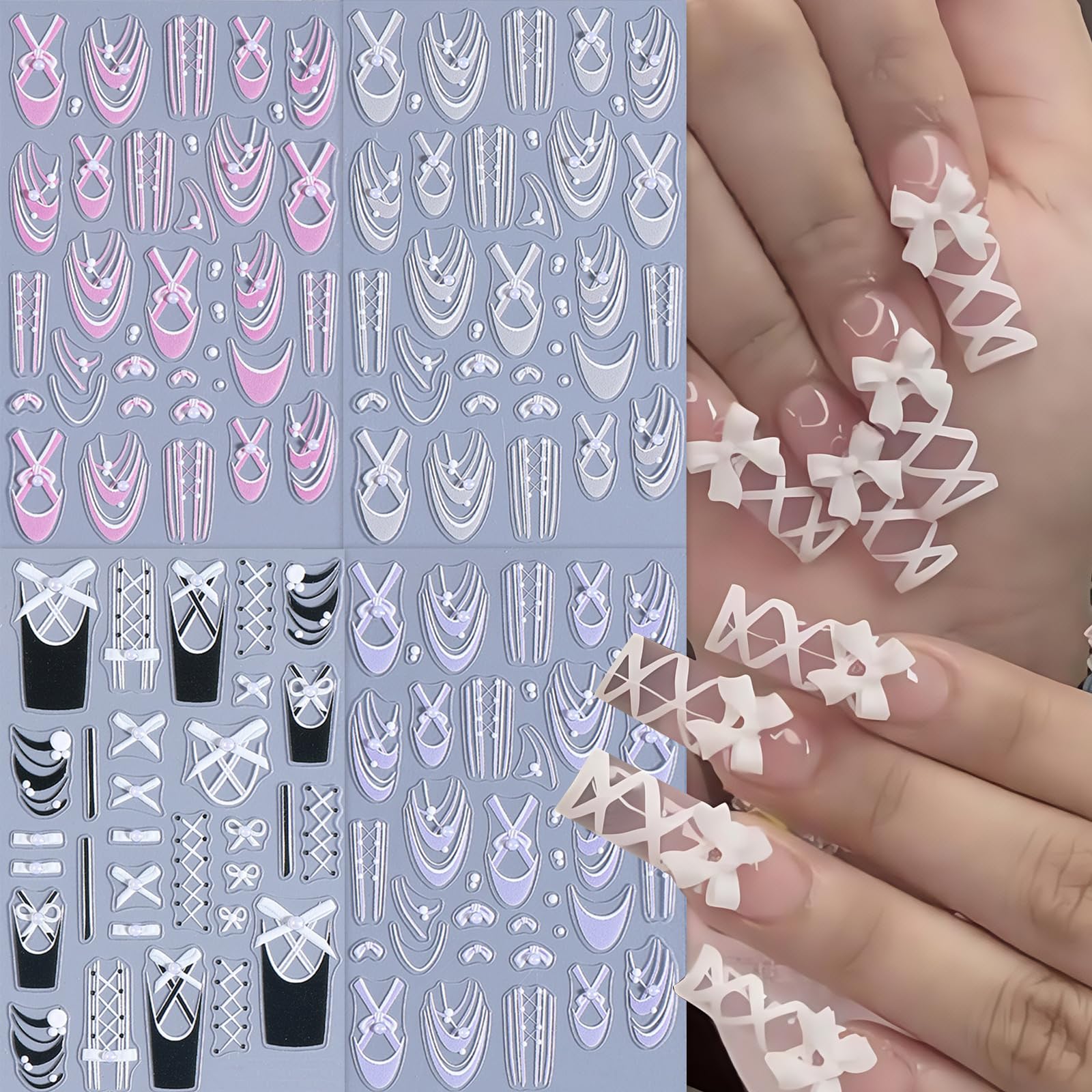 - Easy to Use: This pearl bow french tips nail stickers for nail art is self-adhesive. just use tweezers to tear off the cute nail stickers, and then stick the 5d nail stickers on the nail.You can also use nail gel to cover to make the beautiful stickers last longer