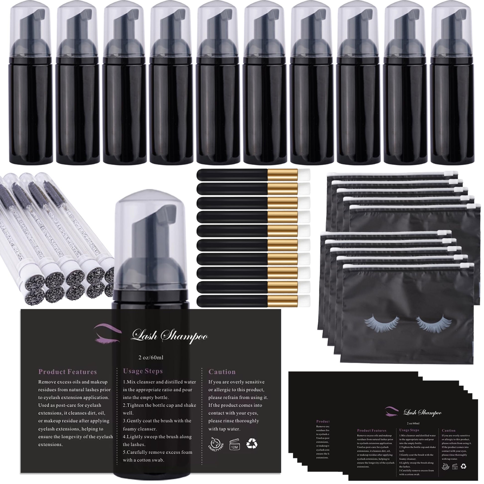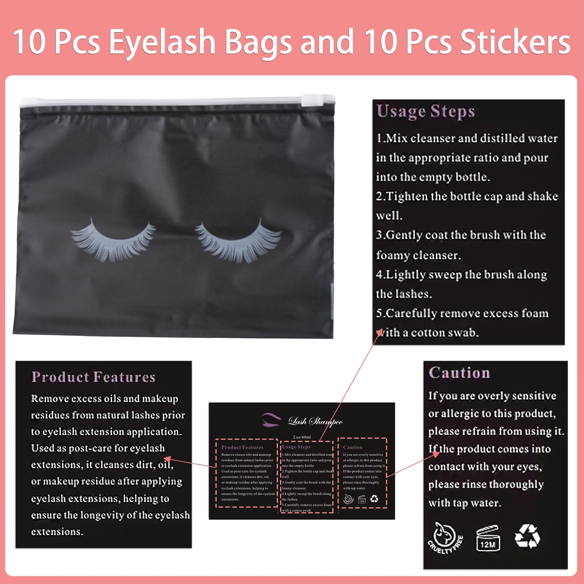 - 【Package Includes】This lash kit set consists of a total of 50 pieces. It includes 10pcs of 60ml lash shampoo bottles(empty), 10pcs of lash shampoo brushes, 10pcs of eyelash cleaning brushes with tubes, 10pcs of eyelash aftercare bags, and 10pcs of lash shampoo labels for bottles.