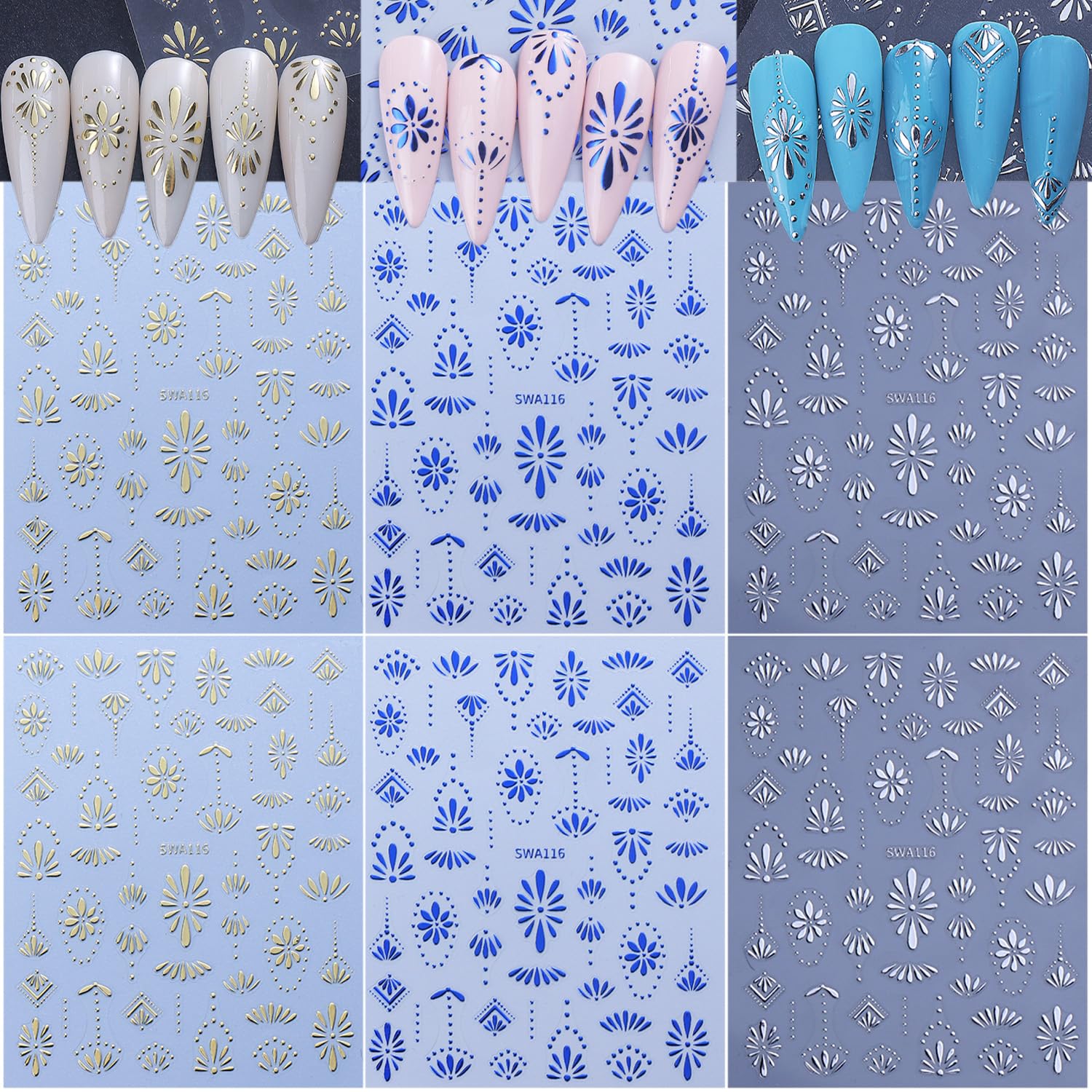 6 Sheets Bohemia Nail Stickers for Nail Art 3D Self-Adhesive Flower Nail Art Stickers Blue Silver Gold Flowers Nail Decals Bohemian Style Nail Design for Women DIY Nails Decoration Supplies