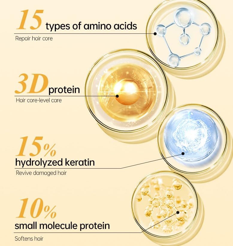 - Gentle & Nourishing Ingredients: Formulated with 15 natural amino acids, 15% hydrolyzed keratin, and 10% small-molecule proteins, the mask repairs from within. It hydrates, smooths, and restores perm/dye-damaged hair for soft, glossy locks.