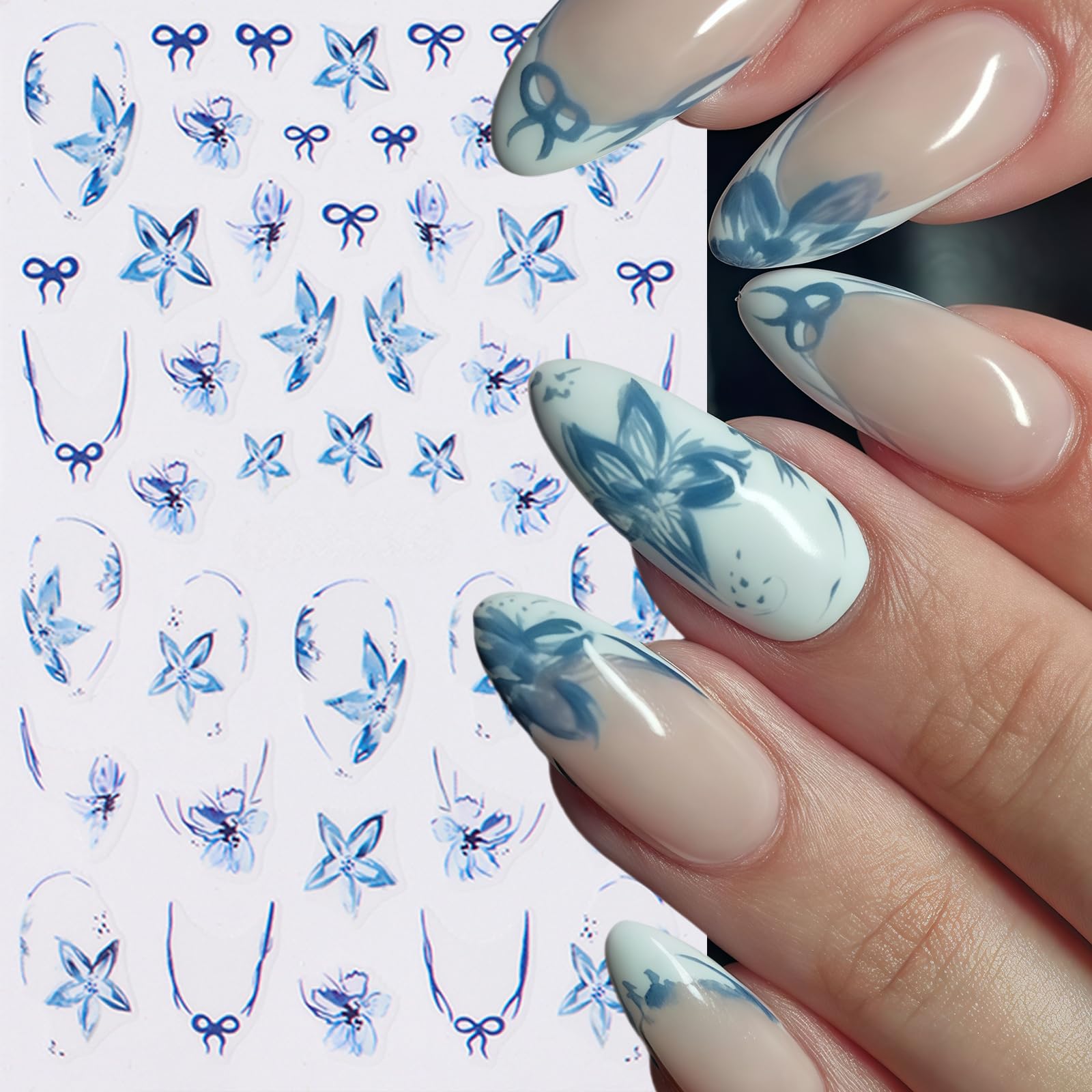 Details: 8 Sheets Blue Flower Bow Nail Stickers, 3D Self-Adhesive French Line Stickers, Lily Design Nail Art decals.