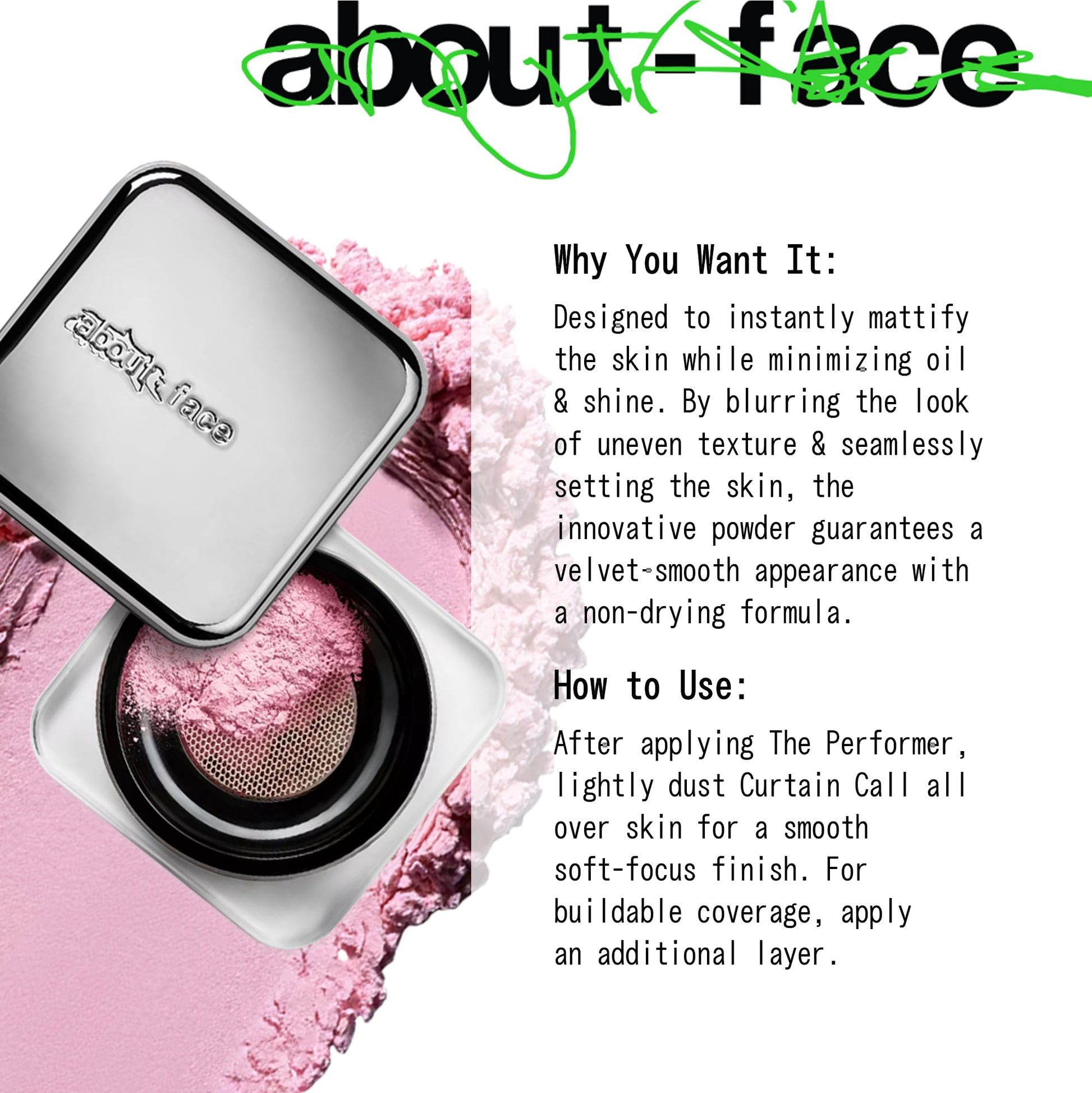 about-face Curtain Call Set & Smooth Loose Powder Finale – Lightweight, Oil-Absorbing Setting Powder with Rice Starch & Corn-Based Talc Alternative – Vegan, Cruelty-Free – 0.35oz (Pink Brightener)