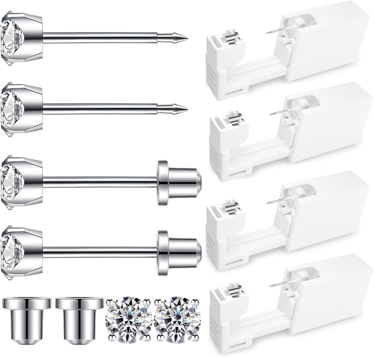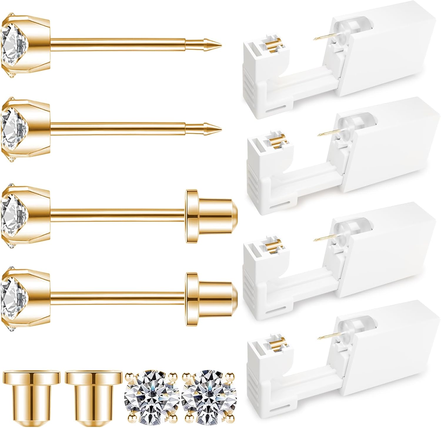 - 【What's in The Box】4 packs disposable ear piercing kits, 4 packs sharp pin stud earrings (4pcs stud earrings are preloaded in the ear pierce gun) 4pcs safety bullet backs to keep your skin safe.