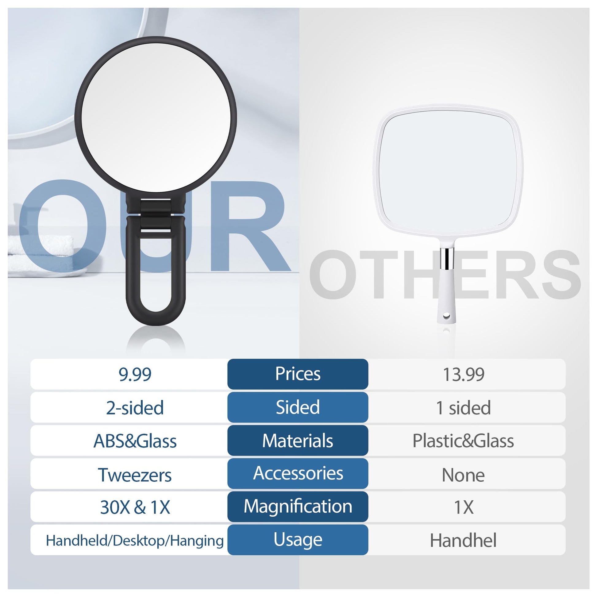 - Double-sided Mirror: This double-sided handheld magnifier is paired with 1X and 30X mirrors, so you can use the corresponding mirror for different needs, like you're getting two mirrors for the price of one