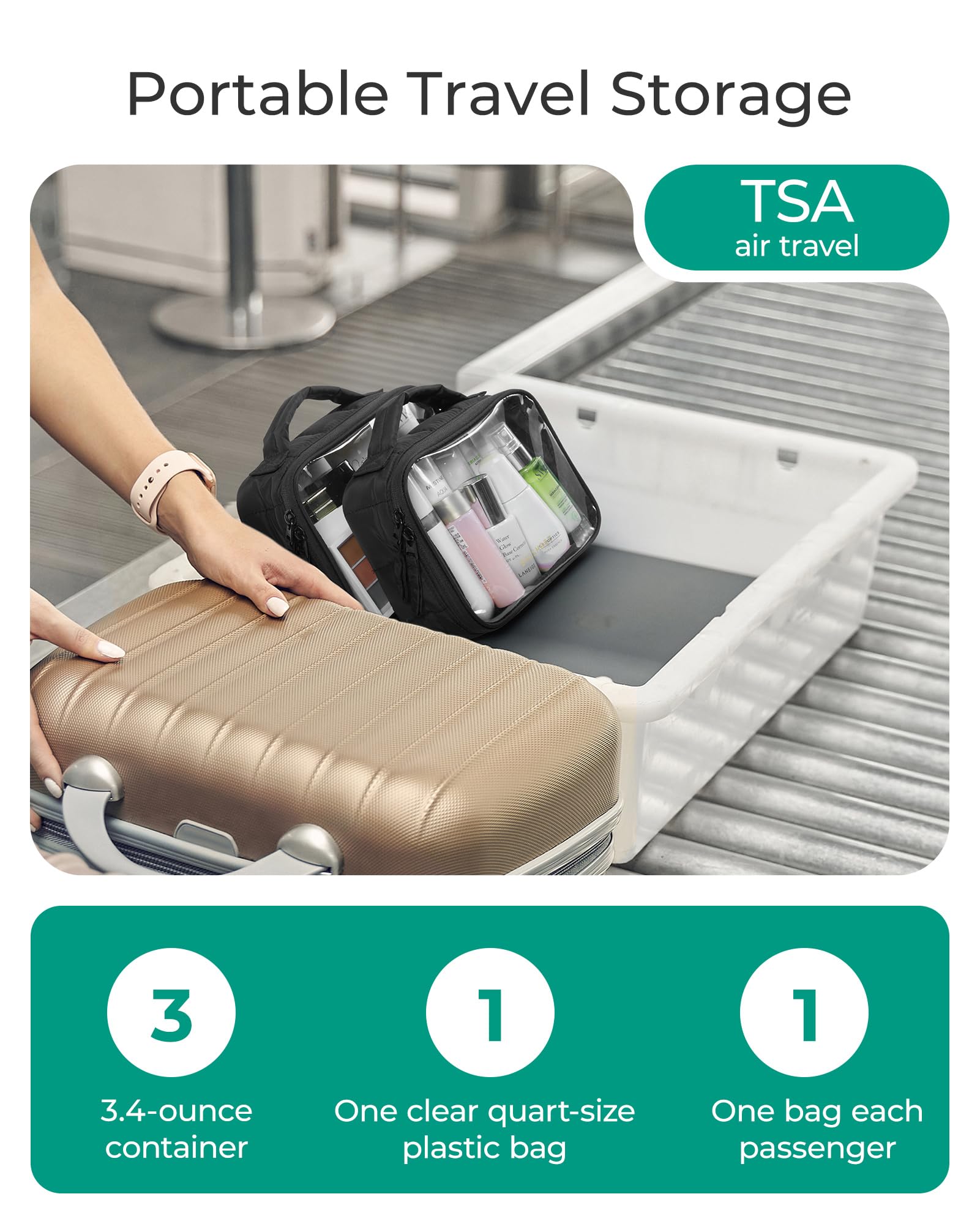 - TSA APPROVED - The 8.26" x 5.9" x 2.75" clear makeup bag complies with TSA's 3-1-1 liquid rule and can hold four 3.4 oz bottles. The all-around transparent design helps to quickly and easily see the contents of your bag, allowing you to breeze through airport security.