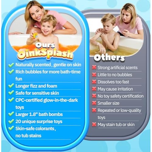 - 20 GLOW-IN-THE-DARK SURPRISES: Each bath bomb hides a glow-in-the-dark resin toy?safe, smooth, and fun for kids to collect. All toys are CPC certified and tested to meet U.S. children¡¯s product safety standards, giving parents added peace of mind. Made from non-glass resin with colorfast finishes, these glowing surprises make every bath safe, playful, and exciting for kids, while keeping cleanup simple and stress-free for parents