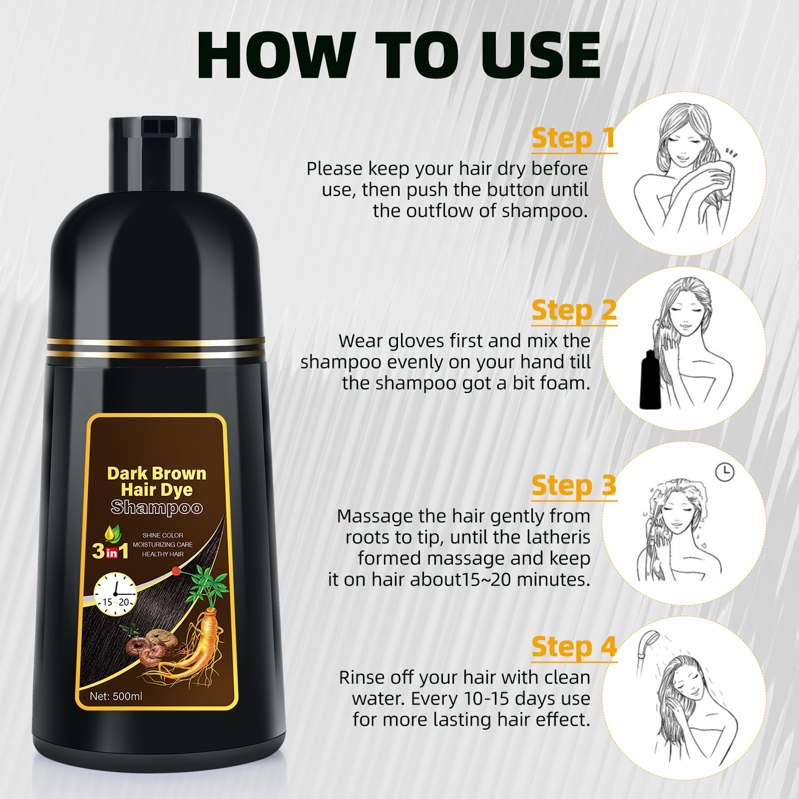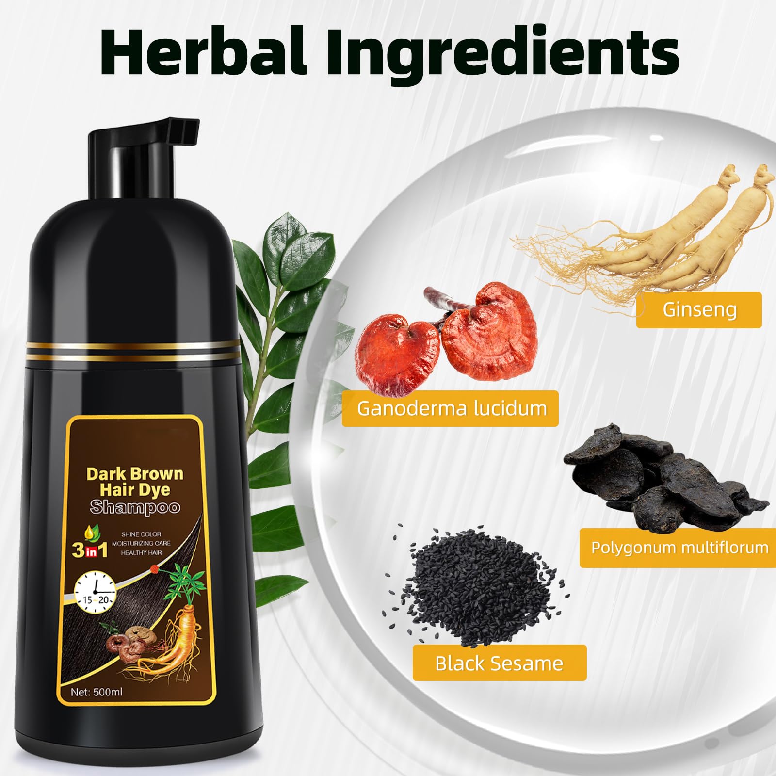- Natural Ingredients for Stronger Hair: Formulated with a mild herbal blend, including Polygonum multiflorum to fortify hair roots and ginseng extract to nourish, our shampoo enhances hair strength and imparts a natural, shiny dark brown hue that remains vibrant for over three weeks. The gentle formula ensures no damage to your hair's integrity.