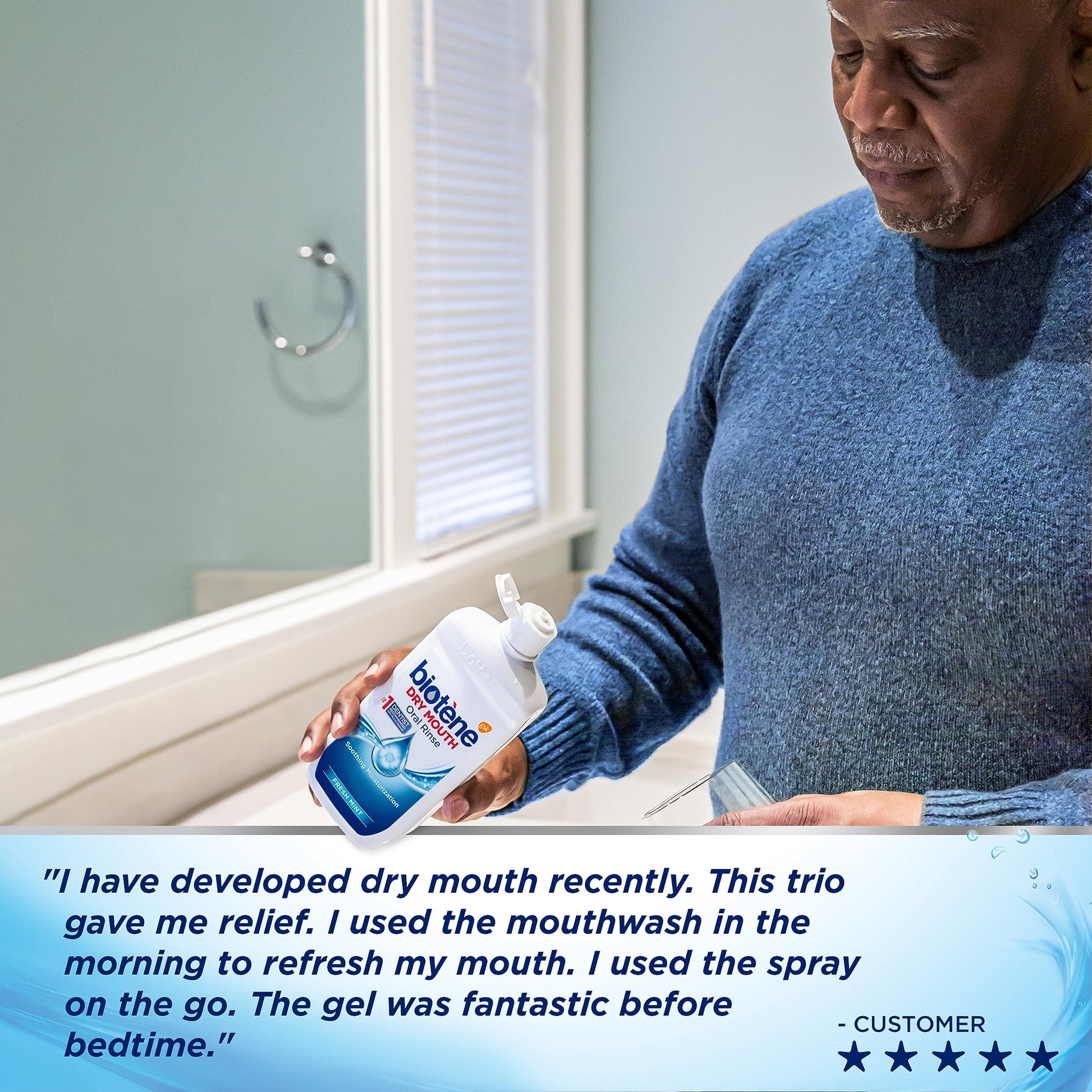 Details: Biotene Dry Mouth Management Kit is ideal for around the clock relief of dry mouth symptoms when used as part of your daily oral health care routine. This oral care kit contains Biotene Dry Mouth Oral Rinse, Moisturizing Spray and OralBalance Moisturizing Gel to help relieve symptoms of dry mouth, including bad breath, stickiness in the mouth, dryness in the mouth and chapped lips. Formulated using a mouth moisturizing system, Biotene Dry Mouth Oral Rinse provides up to four hours of soothing, lubricating relief. For overnight use, Biotene Dry Mouth OralBalance Moisturizing Gel features a moisture lock formula in discreet, easy to apply packaging. Use Biotene Dry Mouth Spray on the go for convenient relief from dry mouth that fits in your purse, backpack or travel bag. Dry mouth rinse, gel and spray are formulated for adults and children 12 years and older. For long-lasting relief of dry mouth symptoms, choose Biotene, the #1 dry mouth brand trusted by dentists.